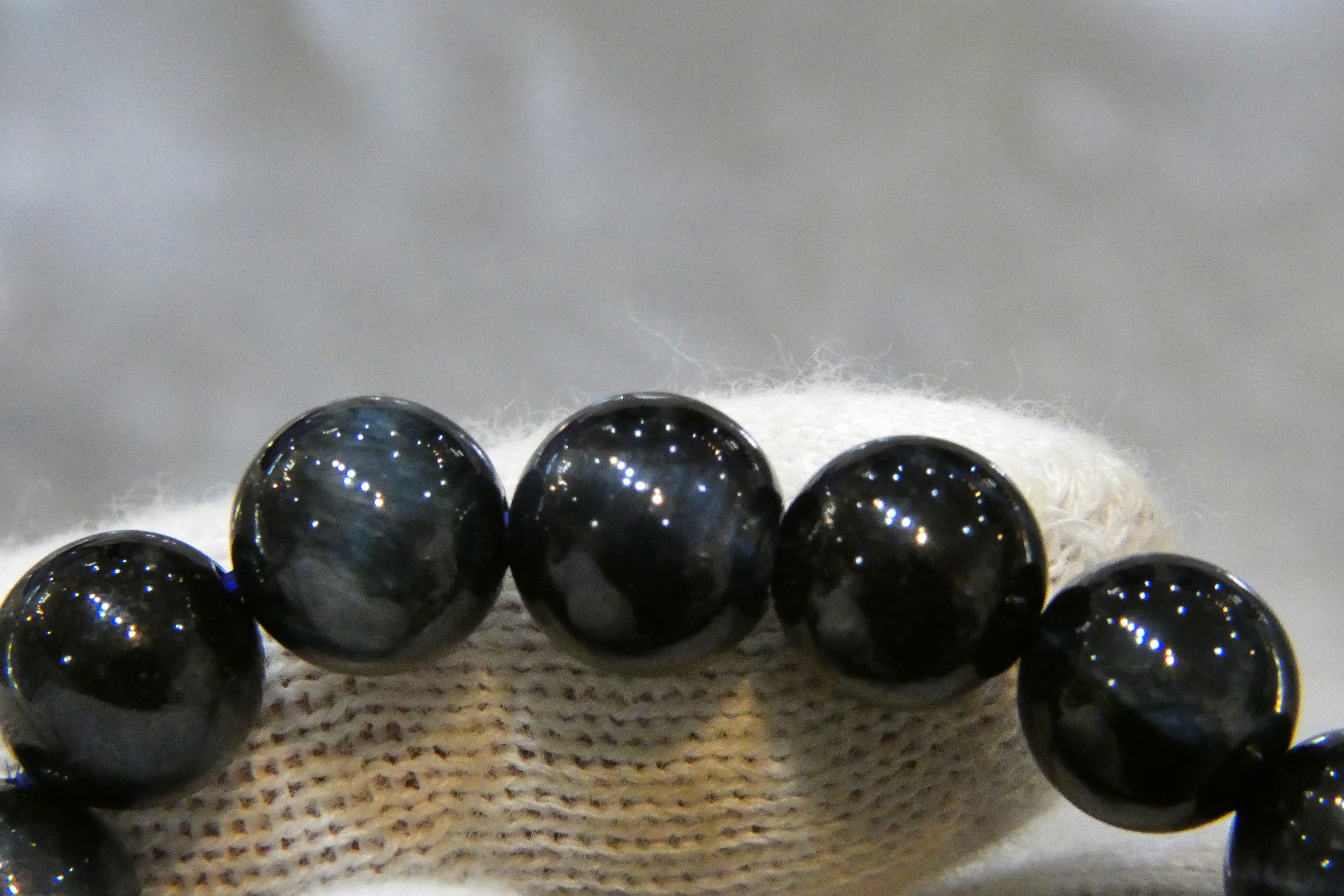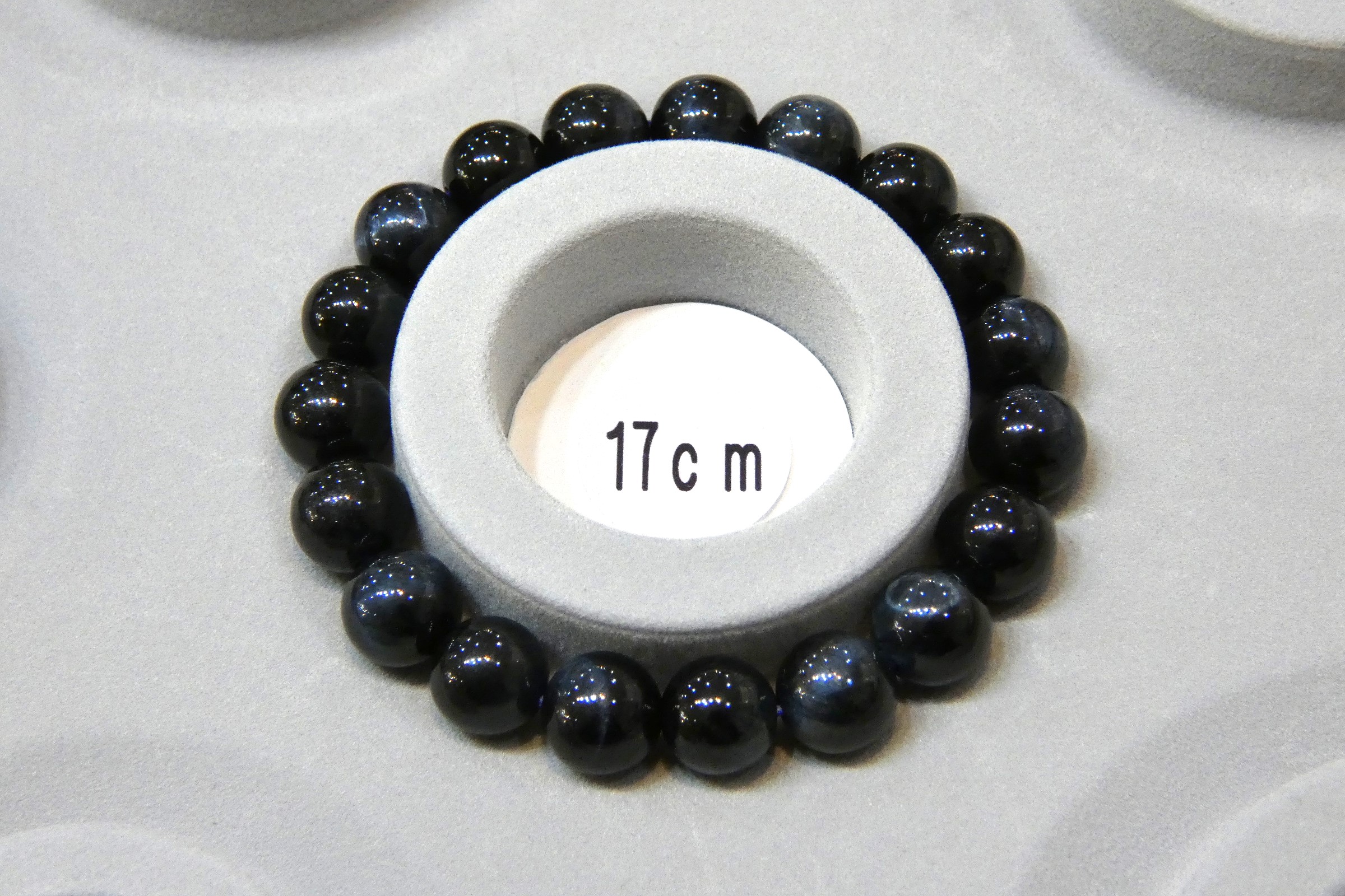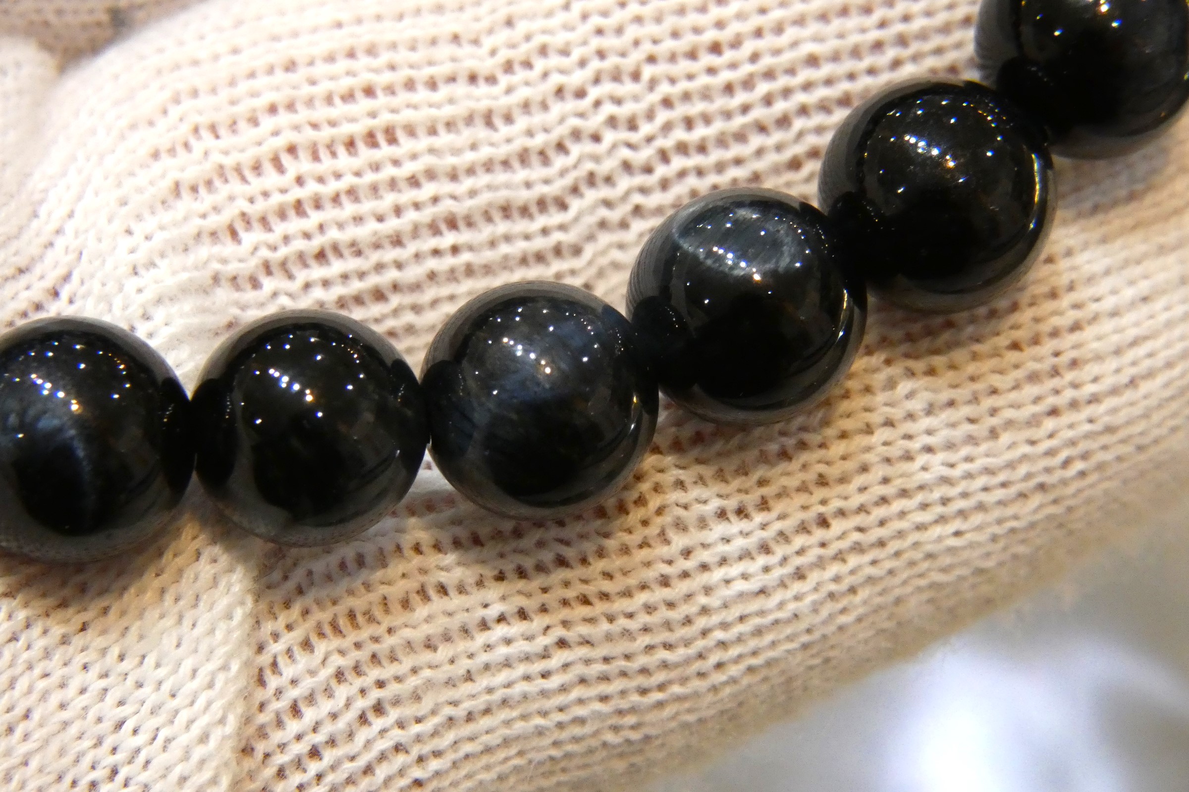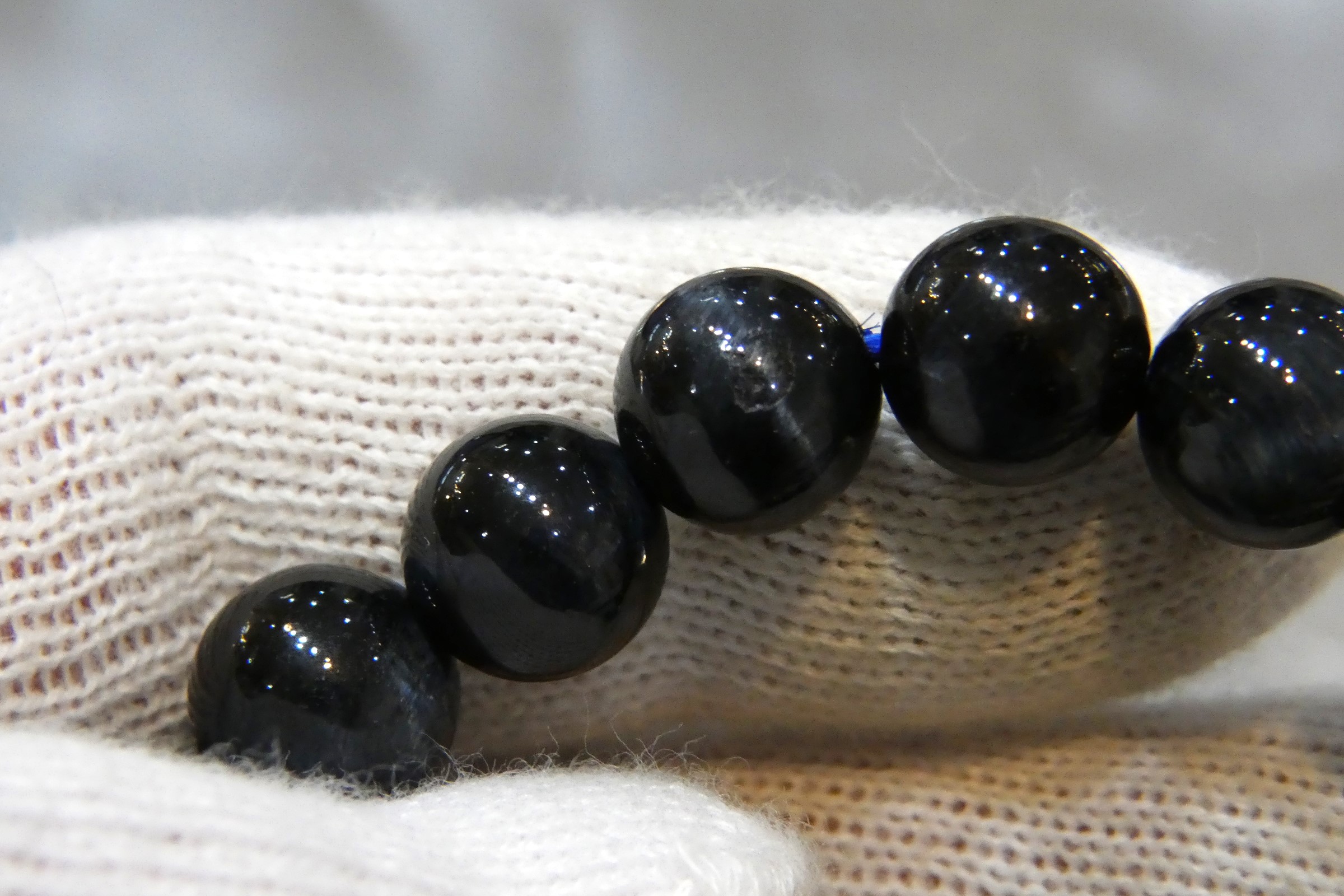 光に当てるとキャッツアイ効果によりブルー/ダークブルーの光の筋が見えます