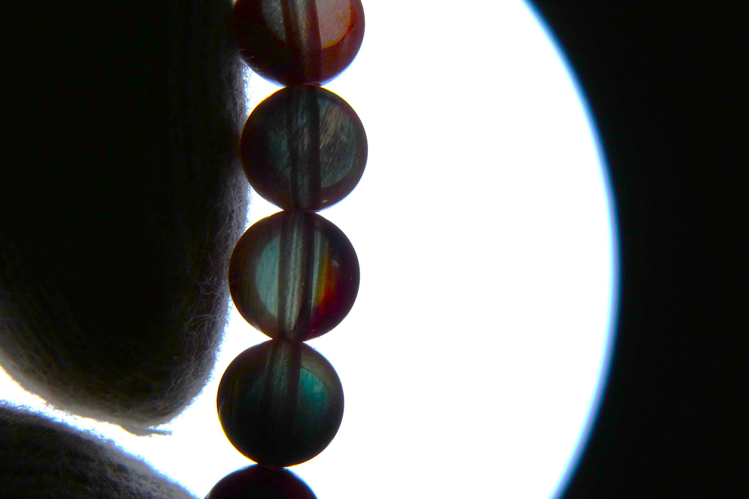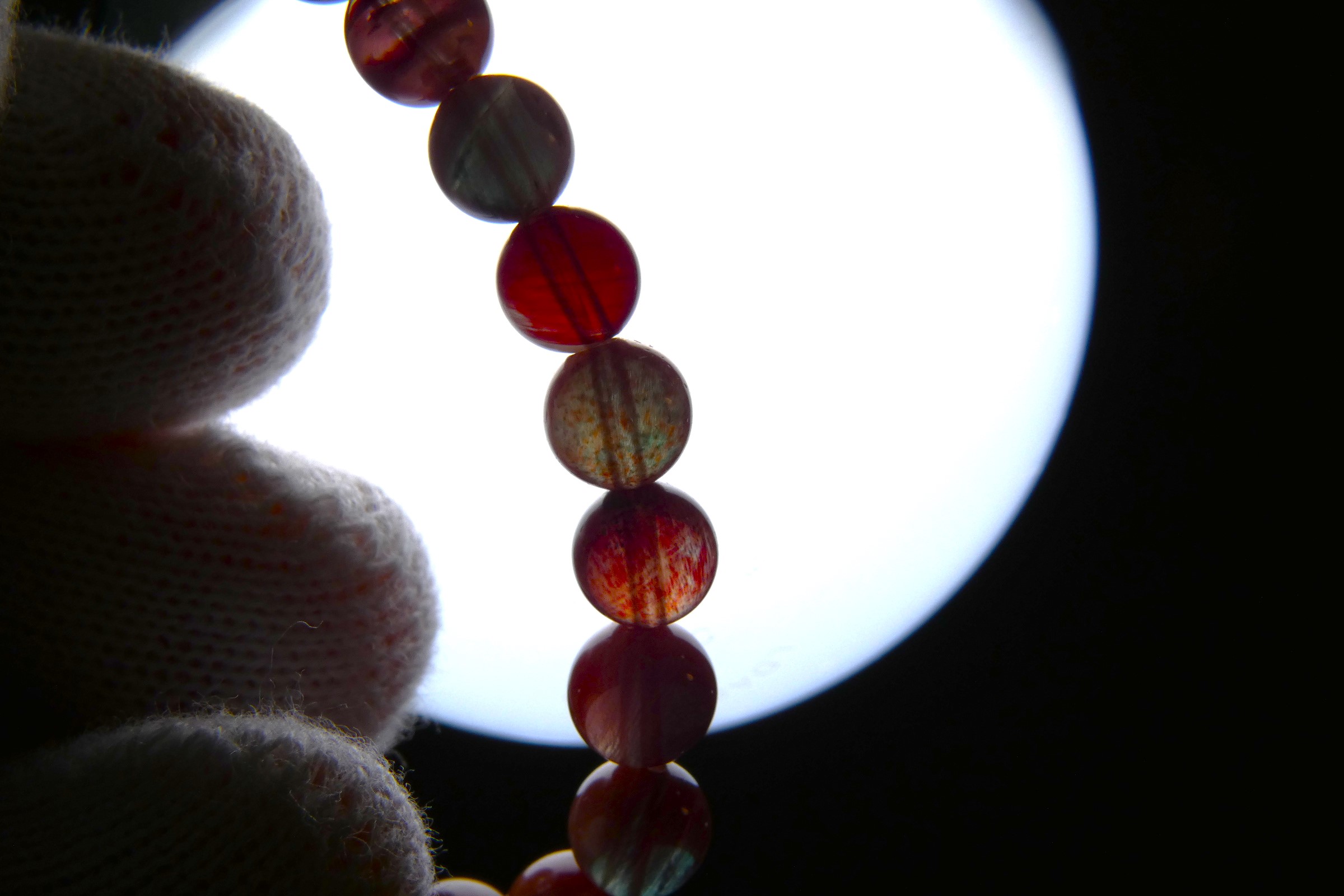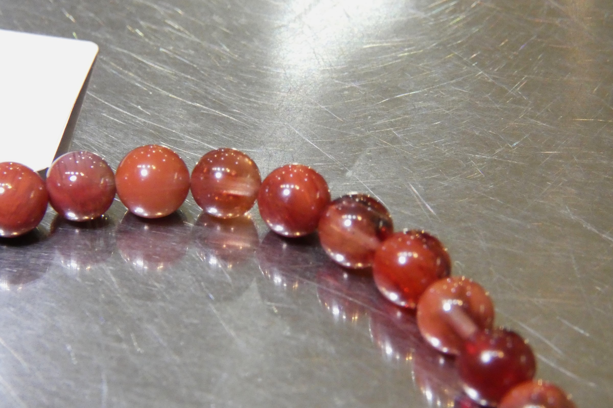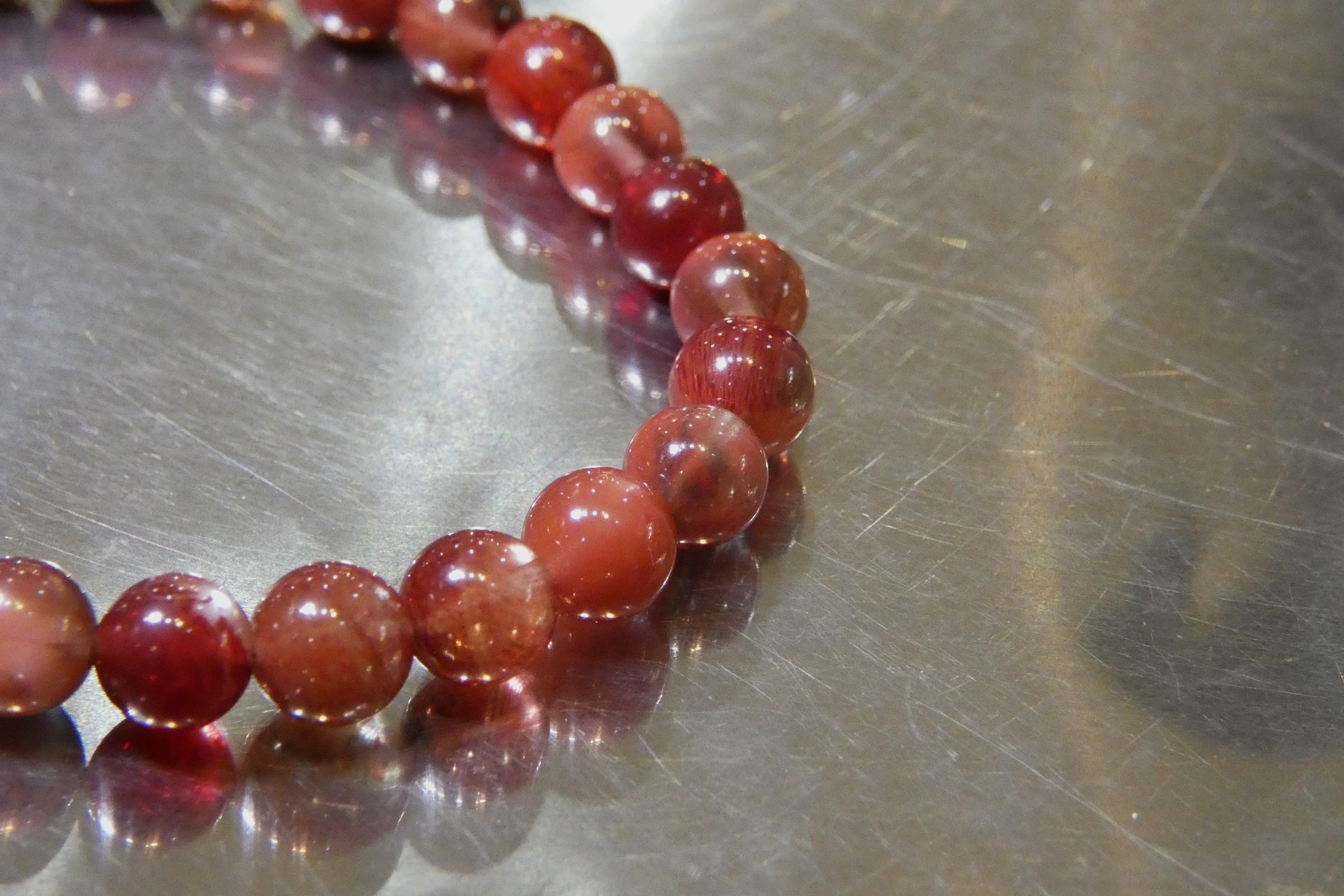 全体は赤褐色ですが角度により青緑色に見える珠もあるレッドアンデシンです
